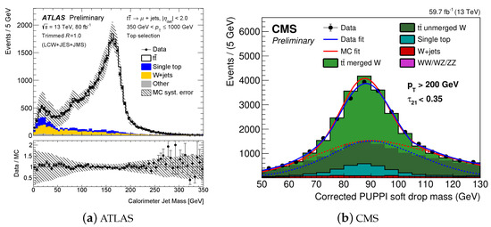 Correcting for possible differences in the jet mass between data and simulation requires a new approach with respect to in situ momentum calibrations, as the jet mass is not an event-conserved quantity unlike the total transverse momentum. It is thus important to identify a high-purity selection of signal jets, where the mass distribution should be the same, and to correct for any observed differences. Both ATLAS and CMS do this using events, where the W boson from one of the top quarks decays leptonically, and the W boson from the other top quark decays hadronically. These semi-leptonic events can be selected with high purity, and provide access to signal jets with either the W boson mass or the top quark mass, depending on if the b-quark from the hadronically decaying top quark is inside or outside of the large-R jet under study. These high-purity selections allow for a direct extraction of the mass scale and resolution by fitting the signal component in both data and simulation, and any subsequent differences can then be corrected for. Examples of this procedure are shown in Figure 15 for top quarks in ATLAS and W bosons in CMS.