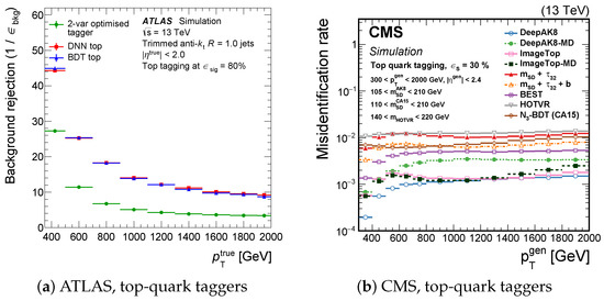 - ATLAS Collaboration. Boosted Hadronic Vector Boson and Top Quark Tagging with ATLAS Using Run 2 Data. 2020. Available online: https://atlas.web.cern.ch/Atlas/GROUPS/PHYSICS/PUBNOTES/ATL-PHYS-PUB-2020-017 (accessed on 30 March 2022).