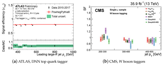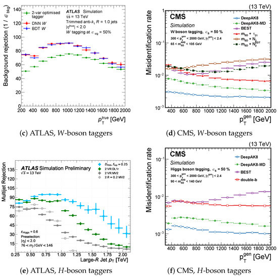 - ATLAS Collaboration. Performance of Top Quark and W Boson Tagging in Run 2 with ATLAS. 2017. Available online: https://atlas.web.cern.ch/Atlas/GROUPS/PHYSICS/CONFNOTES/ATLAS-CONF-2017-064 (accessed on 30 March 2022).
