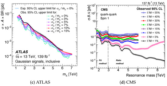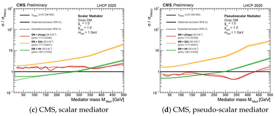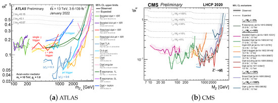 - CMS Collaboration. CMS Exotica Summary Plots for 13 TeV Data. 2022. Available online: https://twiki.cern.ch/twiki/bin/view/CMSPublic/SummaryPlotsEXO13TeV (accessed on 24 May 2022).