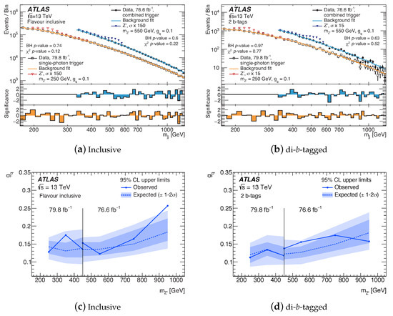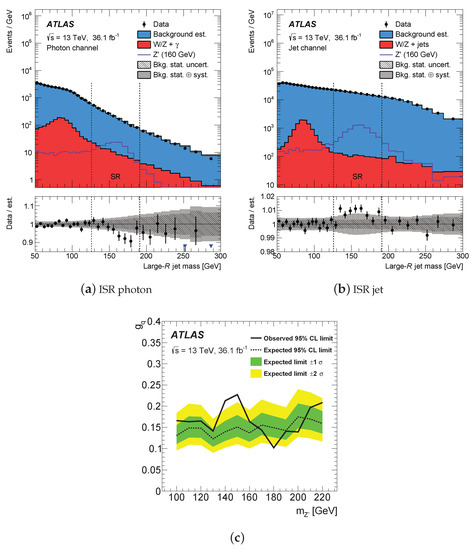 - ATLAS Collaboration. Search for light resonances decaying to boosted quark pairs and produced in association with a photon or a jet in proton-proton collisions at = 13 TeV with the ATLAS detector. Phys. Lett. B 2019, 788, 316–335. [Google Scholar] [CrossRef]