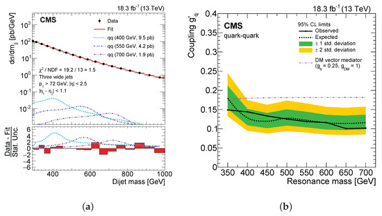 - CMS Collaboration. Search for dijet resonances using events with three jets in proton-proton collisions at s = 13 TeV. Phys. Lett. B 2020, 805, 135448. [Google Scholar] [CrossRef]