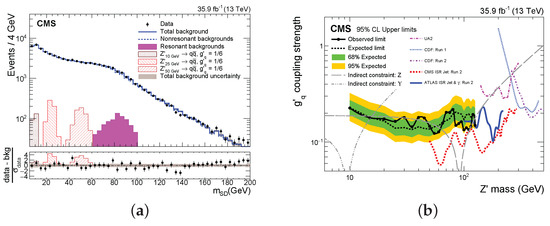- CMS Collaboration. Search for low mass vector resonances decaying into quark–antiquark pairs in proton-proton collisions at = 13 TeV. Phys. Rev. D 2019, 100, 112007. [Google Scholar] [CrossRef] [Green Version]