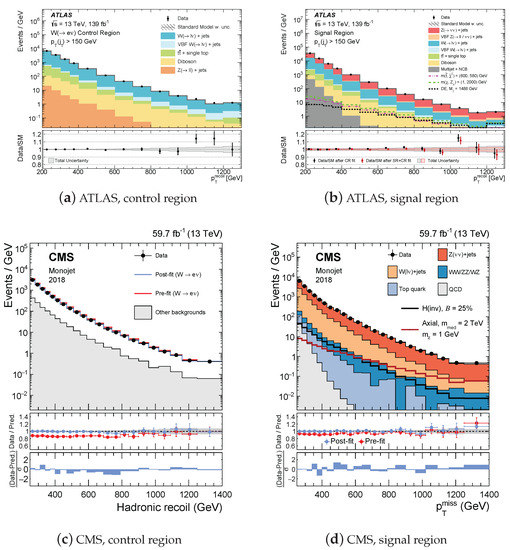 - ATLAS Collaboration. Search for dark matter in events with a hadronically decaying vector boson and missing transverse momentum in pp collisions at = 13 TeV with the ATLAS detector. J. High Energy Phys. 2018, 10, 180. [Google Scholar] [CrossRef] [Green Version]