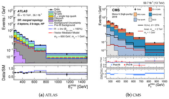 In order to maximize the potential to discover new physics at the LHC, it is important to have as large of a dataset as possible, therefore mitigating the probabilistic nature of both proton–proton collisions and the subsequent particle interactions. One way to increase the dataset size is to collide multiple pairs of protons simultaneously, as the probability to produce a very rare interaction is thus enhanced by the number of concurrent collisions; the LHC did this during Run 2, with an average of roughly 30 simultaneous collisions. In cases where a rare process occurs, this typically results in one rare high-energy process (usually called the hard-scatter collision) and several other lower-energy processes (usually called pileup collisions). Particles from these pileup collisions can pollute the hard-scatter process, as the detector records all of the sources of energy, and it is left to reconstruction procedures to tell apart the different origins of each energy deposit in the detector. This is a challenge for all types of analyses, but it is particularly challenging for hadronic final states as the jets used to reconstruct hadronic interactions are large and thus more susceptible to randomly overlapping contributions from pileup collisions. Furthermore, as shown in Figure 3, hadronic processes are the most common visible by-product of proton–proton collisions at ATLAS and CMS. It can therefore be difficult to differentiate between hadronic physics originating from the hard-scatter process, as opposed to the pileup collisions, which is a problem that many searches for new physics in hadronic final states must address. The searches presented in Section 4, Section 5 and Section 6 use a variety of different techniques to mitigate the impact of pileup on their respective sensitivities to new physics.