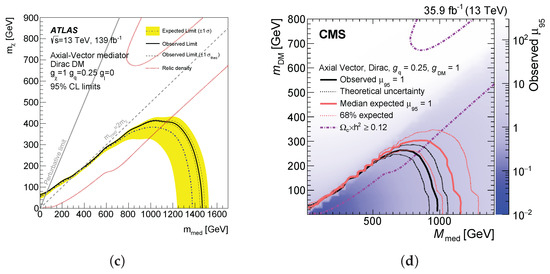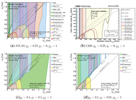 - LHC Dark Matter Working Group. Comparing LHC Searches for Dark Matter Mediators in Visible and Invisible Decay Channels and Calculations of the Thermal Relic Density. Phys. Dark Univ. 2019, 26, 100377. [Google Scholar] [CrossRef]