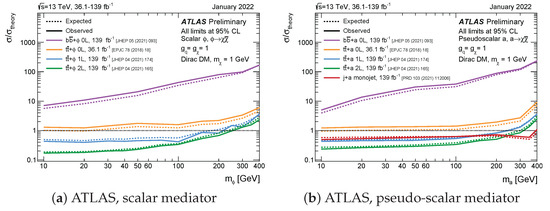 - ATLAS Collaboration. Dark Matter Summary Plots for s-Channel and 2HDM+a Models. 2021. Available online: https://atlas.web.cern.ch/Atlas/GROUPS/PHYSICS/PUBNOTES/ATL-PHYS-PUB-2021-045 (accessed on 30 March 2022).
