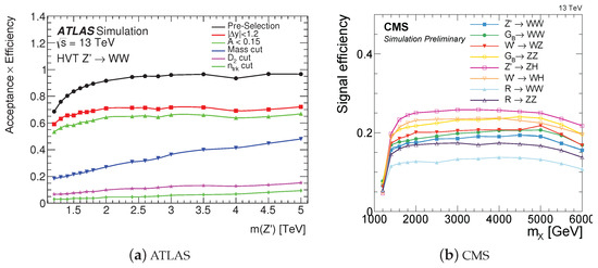 Most of the CMS searches that will be presented have used particle flow inputs to the anti- algorithm with , although in some cases Cambridge–Aachen (CA) jets [30] with have been used instead, especially for searches where top quarks are at a lower momentum and thus a larger radius is needed to contain the full decay. Most of the Run 2 results are then groomed using the Soft Drop algorithm [31,32] with a soft threshold cut and an angular exponent . In addition to grooming, it is possible to apply further selections on the jet inputs; CMS does so by applying the same PUPPI algorithm discussed in the context of small-R jets to the reconstruction of large-R jets. The subsequent CMS plots will focus on jets built using the anti- algorithm with and Soft Drop grooming plus PUPPI applied, as that was the most common large-R jet strategy employed by the relevant searches.