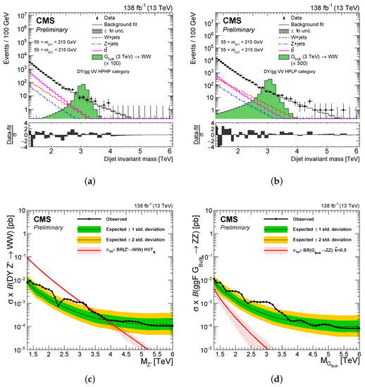 - CMS Collaboration. A multi-dimensional search for new heavy resonances decaying to boosted WW, WZ, or ZZ boson pairs in the dijet final state at 13 TeV. Eur. Phys. J. C 2020, 80, 237. [Google Scholar] [CrossRef] [PubMed] [Green Version]