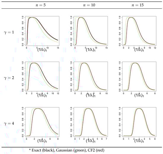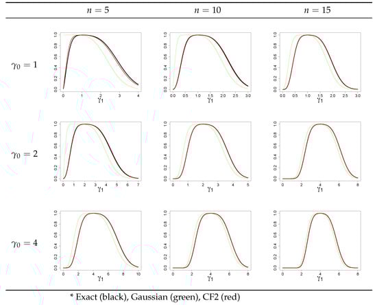 The type-2 error performance of the approximate distributions was assessed by varying the values of the parameters and and generating the corresponding operating characteristic (OC) curves in Figure 3 and Figure 4. The OC curves only display the CF-2 approximations since the CF-1 approximation is very similar and would be difficult to determine the distinction between each graphically. The similarity between CF-1 and CF-2 approximations is demonstrated in a specific case presented in Table 2.