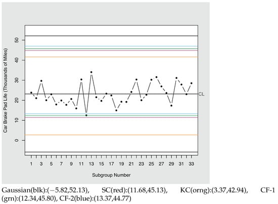 A dataset in which the lifetime of 98 randomly sampled car brake pads are reported in [20]. Assuming these were collected in subgroups of size , the summary measures of the distribution of the sample mean were calculated according to Equation (13) and are given by , , , and . A -chart with the sample data plotted against Gaussian/Shewhart, SC, KC, CF-1, and CF-2 limits is given in Figure 5.