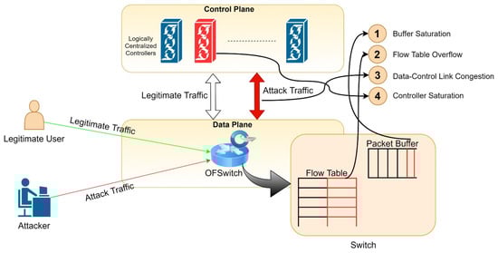 Vulnerabilities in SDN exploited by DDoS [28]. Reprinted/adapted with permission from ref. [28]. 2022, Elsevier.
