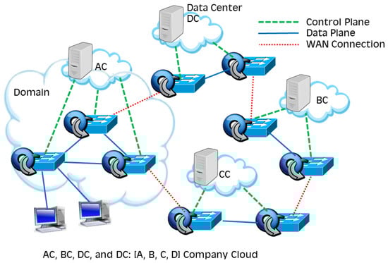 According to the needs and characteristics of the unit, we have planned a cloud service system architecture, as shown in Figure 2, in which AC, BC, and CC provide customized services for private clouds, and DC provides general services and data centers. Information between domains is connected through switches (red dotted lines), and each controller is responsible for the topology and packet forwarding rules in the domain, as shown in the control plane (green dotted lines) and data plane (blue lines). In each network domain, switches provide link information to the controllers. When no entry information is found in the flow table, the switch requests the controller for packet-forwarding rules. The cloud service system in this study was verified using an SDN design and implementation. The system topology is illustrated in Figure 3.