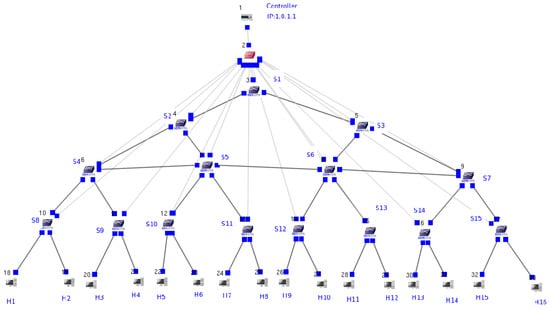 The main components of this topology include the Ryu OpenFlow controller and OpenFlow switches (see S1–S15 in Figure 3). We assumed that the switch from S8 to S15 is connected to two hosts, denoted by H1 to H16. Enabling the MAC address-learning function on the controller avoids network loops. The configuration settings of each device are listed in Table 2, which records the device configuration (including the interface and MAC address) of the 33 nodes. The switch in red in Figure 3 is the control plane switch designed by the EstiNet simulation software, which connects the interface between the OpenFlow controller and OpenFlow switch. The device is not part of the OpenFlow architecture because the OpenFlow switch is a L2 device, so it cannot be configured with IP addresses. To communicate with the controller, EstiNet adds an OpenFlow controller switch device to the GUI to provide an interface. The switch can be connected to this OpenFlow controller switch by an IP address, allowing the controller to control any specified OpenFlow switch and communicate with it properly.