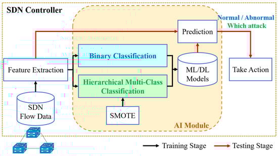 To detect abnormal packets in the SDN network early and classify the attack type, we deployed an AI module in the controller. The AI module process is shown in Figure 4. In the training phase, we used two SDN public datasets to train the models for binary and multiclass classification. Binary classification is designed to distinguish between normal and abnormal, and multi-class classification is aimed at abnormality. Attacks can be classified into several types. There were eight ML and five DL algorithms in the AI model category. In the prediction phase, the network flows first enter the AI module, perform feature extraction, and then predict the binary classification or multiclass classification model. Finally, the controller uses the predictions to decide whether to act on network traffic.
