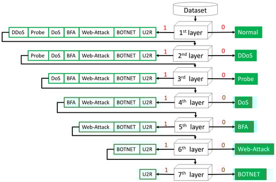 Multiclass classification is required because it is necessary to further identify the category of the abnormal behavior. When the training dataset is unbalanced, the performance of multiclass classifiers decreases with an increasing number of classes, especially with a small number of classes (called minority classes); however, the overall average accuracy was good. Aiming at minority classes, we transform the multiclass classification problem into a hierarchical multi-classification (HMC) architecture. We adopted a top-down approach based on the divide-and-conquer strategy. The architecture is illustrated in Figure 5. The classifiers in the hierarchical mechanism can be any binary classifiers described in the previous subsection. First, we labeled the current class 0. The remaining categories were marked as 1. Training is conducted based on the number of samples in the class, that is, the class with the greatest number of samples is trained first and training is performed only once.