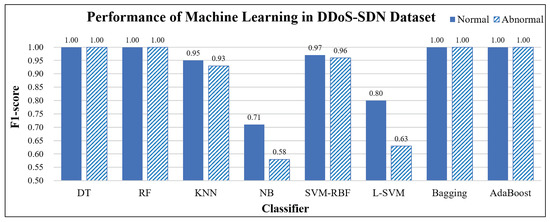 The challenges of SDN environment deployment arise from vulnerabilities and threats, so an IDS that monitors malicious activity is a critical measure in the network architecture. Although a centralized model of SDN can facilitate new practical applications, the detection of DDoS attacks is used to test the effectiveness of AI approaches based on datasets used in related research. The model prediction accuracy is directly related to the training dataset. Most public datasets collected from traditional networks are used to predict anomaly detection in SDN; however, public datasets such as KDD’99 [13] and NSL-KDD [14] are incompatible and outdated. Elsayed et al. released the InSDN dataset [2] in 2020 and carried out multi-class classification for seven abnormal attacks, including DDoS, DoS, password-guessing attack (PGA), web attack, botnet, probe, user to root (U2R), and normal packets. We evaluated eight common ML algorithms: decision trees, random forests, AdaBoost, KNN, naive Bayes, support vector machine with linear kernel, radial basis function (RBF), and multilayer perceptron (MLP).