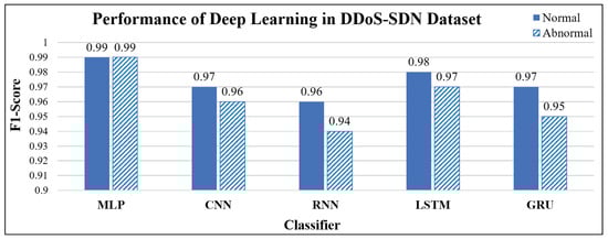 The experimental results showed that the DT, RF, bagging, and boost of ensemble learning had the best performance (F1 = 1) among the ML models. In contrast, NB had the worst performance (F1 = 0.58, abnormal packets). In addition, Figure 7 shows the performances of the five DL models. After optimizing the parameters, the F1-score for both categories is 0.95 and 0.99. This result indicates that tree, ensemble learning, and neural network models can effectively predict DDoS attacks.