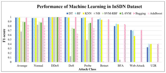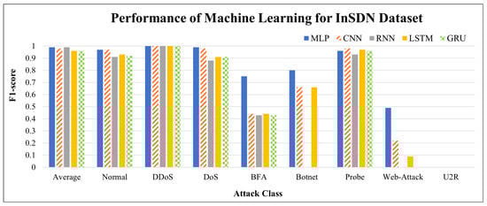 In the second stage, we used the InSDN dataset to validate the prediction of the AI module for multiclass anomalous attacks in an SDN environment. The same eight machine learning and five DL models were used in the first stage, and the performance classifications are shown in Figure 8 and Figure 9, respectively. The horizontal axis represents the overall F1-score performance and normal and seven abnormal attack performances. Figure 8 shows the performance comparison of machine learning for various attacks. From the overall average performance (see the first set of data in Figure 8), the performance of each classifier was good (excluding NB; the F1-score was above 0.83). In detail, normal packets, DDoS, DoS, and probe attacks have good identification performance, whereas botnets, BFA, web-attack, and U2R have poor performance in sequence. Next, we compare the number of classes, as shown in Table 3. There is a clear relationship between poor performance and insufficient data; therefore, this is a problem of uneven training performance caused by a significantly imbalanced dataset.