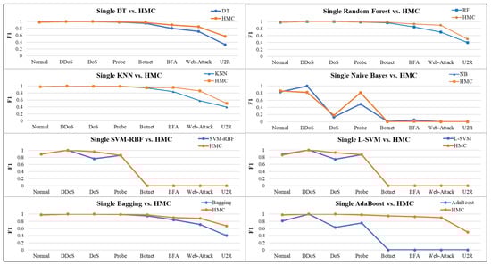 In the third stage, we compare the performance of HMC with 13 single classifiers, which are the same as above, focusing on the minority classes, as shown in Figure 10 and Figure 11, respectively. As shown in Figure 10, the HMC architecture with AdaBoost as the core classifier exhibited the best performance, followed by bagging. Regarding minority classes, we see that AdaBoost-based HMC in the U2R class attaches a 0.5 F1-score (original F1 is 0) and bagging-based HMC attaches a 0.67 F1-score (original F1 is 0.4). For the web-attack class, the AdaBoost-based HMC obtained a 0.88 F1-score (original F1 was 0.71) and bagging obtained a 0.9 F1-score (original F1 was 0). Because the two classification methods, AdaBoost and bagging, use ensemble learning as the strategy, it also shows that multi-classifier decision-making contributes to the identification ability of the final prediction.