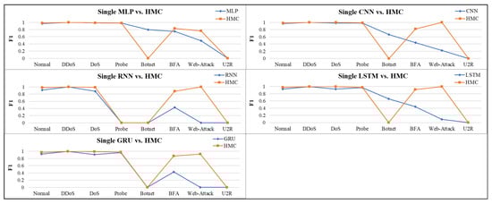 The experimental results show the model prediction performance under binary and multiclass classification compared with eight machine learning and five DL models. We found that decision trees (DT), random forests (RF), bagging, and AdaBoost performed the best among the machine learning models, although DL models were also good. In terms of multiclass classification, the performance of the above single multiclass classifier is extremely poor owing to the small amount of training data for the minority classes, such as brute-force attack (BFA), botnet, user-to-root (U2R), and web-attack. We observed a significant improvement in the HMC architecture for multiclass classification.