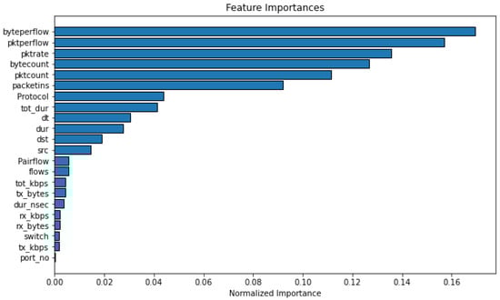 As shown in Figure 13, in the DDoS-SDN dataset, the features are sorted according to their importance, which is calculated using the information gain. For example, byteperflow, pktperflow, pktrate, bytecount, pktcount, and packets were the first six important characteristics for identifying DDoS packets. Compared with the InSDN dataset, as shown in Table 8, we list the top 20 features (IG > 0) that can be used as a basis for feature selection for model performance and efficiency. The first three features (i.e., Dst Port, Init Bwd Win Bytes, and Pkt Len Max) have large IG values, and these features also help correctly identify whether the packet is normal or malicious.