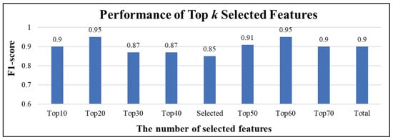Finally, we selected the top k features to compare the feature performances, as shown in Figure 14. The experiment was evaluated based on a decision tree model. The horizontal axis in Figure 14 is the selection of the top 10 to the top 70 and a total of 83 features; the selected is the baseline (48 features are used in InSDN). The ranking of k is based on the information gain. The higher the value of k, the more critical it is. The test method employed ablation analysis. Each feature was excluded individually, relative to the overall performance, to examine the importance of that feature. The results show that selecting the top 20 and 60 features has the best F1 score (0.95), which is an interesting result. When we prioritize a lower model complexity, a model trained on the top 20 features is likely to exhibit the best performance and efficiency. Nonetheless, when we are concerned about the need to identify multiple types of attacks, particularly for minority sample classes, using the top 60 features may be more helpful in indicating the differences between attack classes; therefore, using few-shot learning by selecting relevant features to tackle unknown threat prediction is a future research direction.