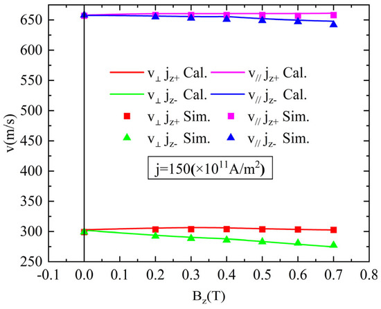 Axial magnetic field dependence of skyrmion velocity. The current density is fixed at . Symbols are numerical simulation results whereas solid lines are analytical results obtained from Equation (6).