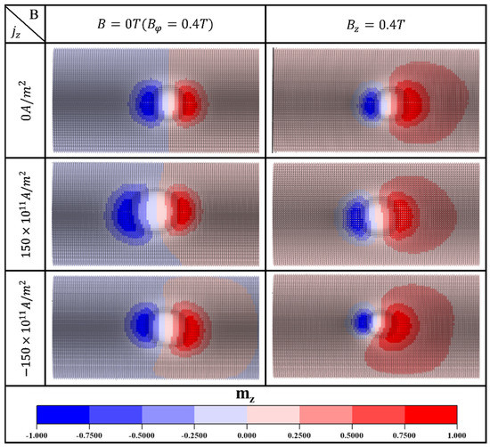 In the steady state without external magnetic fields and current, the Néel-type skyrmions are stretched into elliptical structures along the axial direction due to the influence of the nanotube curvature [52]. Electric currents in different directions stretched the skyrmions along the Hall angle, but the skyrmions were basically symmetrical in configuration. When a tangential magnetic field was applied, the overall magnetic moments of the system were slightly deflected toward the magnetic field, but the symmetry of the skyrmions stretched by the electric current were basically the same as in the condition with no external field. When an axial external magnetic field was applied, the skyrmions were stretched into a configuration that was evidently asymmetrical and was distinct in size under the impact of current, as shown in Figure 4.