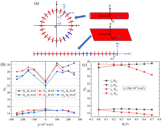 We first investigated the influence of spin-polarized current density on under different external fields. Figure 6b indicates that was very slightly affected by current density, whereas was significantly affected. Once the applied current density was greater than the threshold (pinning current ), increased significantly regardless of whether the direction of the current was z+ or z−. In addition, when the external magnetic field was along the axial direction, the degree of the asymmetry of in opposite current directions was the highest (the imparity between the maximum value and the minimum value was around 20%), whereas the one in the other two cases was less than 8%. In order to further study the influence of the axial external magnetic field on dissipation tensor , we fixed the current density at , and changed the intensity of the axial magnetic field. The results (Figure 6c) are very similar to the effect of the magnetic field strength on the skyrmion velocity (Figure 3). When the direction of the driving current was antiparallel to the magnetic field, , especially , decreased obviously with the increase in the magnetic induction; when the direction of the driving current was the same as the magnetic field, remained basically unchanged whereas increased slightly with the magnetic induction. As for , the results of all numerical calculations were in the interval of (−1, 1), and there was no obvious regularity. Finally, we substituted the calculated dissipation tensor in each case into Equation (6) to obtain the theoretical value of skyrmion velocity (plotted with solid line in Figure 2) solved by the Thiele function, which was highly consistent with the micromagnetic simulation results shown in the previous section.