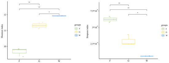 Richness and diversity of bacterial communities in the gut of Apostichopus japonicus (G), surrounding water (W), and feed (F). The Shannon with higher indices indicates higher sample diversity. On the contrary, a lower Simpson index indicates higher diversity. * represents a p value less than 0.05, indicating a significant difference; ** represents a p value less than 0.01, indicating an extremely significant difference.