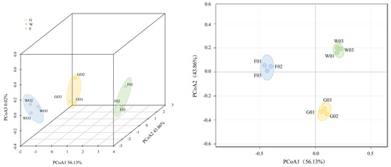 The differences in the microbial communities among the three groups of samples was assessed by 3D PCoA (Figure 2). The contributions of the principal coordinates were: first = 54.91%, second = 44.62%, and third = 0.29%. Samples from the same group were clustered closer together than those from different groups. Groups G, W, and F were scattered in different quadrants within the two-dimensional plane of principal components consisting of PCoA1 and PCoA2, with samples from the same group clustered closer together than those from different groups. This indicates good biological reproducibility within the three sample groups and significant differences between groups (p < 0.05).