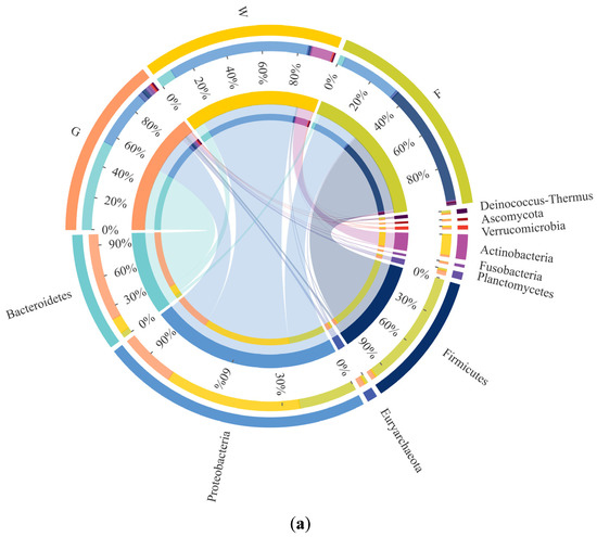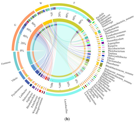 Relative abundance of the dominant bacteria in the gut of Apostichopus japonicus (G), surrounding water (W), and feed (F) at the (a) phylum and (b) genus levels. Tracks are distinguished by different colors and labels, showing the relative abundance of each bacteria in each group, and the relative abundance of each bacteria contained in each group by grouping and bacteria linkage.