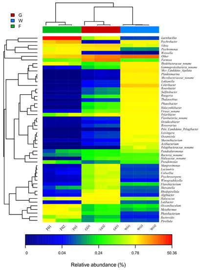 Hierarchically clustered heatmap of the bacterial distribution of Apostichopus japonicus (G), surrounding water (W), and feed (F) at the genus level. The relative values for the bacteria are indicated by the color intensity with the legend.