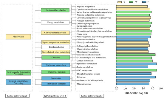 Differences in the abundance of KEGG pathways in the bacterial communities of Apostichopus japonicus (G), surrounding water (W), and feed (F) by LefSe analysis. The LDA score indicates the extent of the impact of significantly different pathways among the three groups: the larger the value, the more significant the difference. Different colors represent significant differences.
