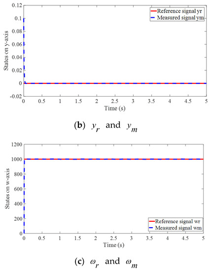 The steady states of errors of movements and rotation are ranged in (mm), (mm), and (V). The overshoots of movements are mostly zero and overshoot of speed control is (V). Settling times of movements and speed are (s), (s), and (s). The measured and referenced signals are shown in Figure 4 below.