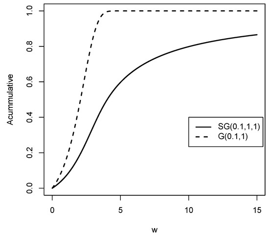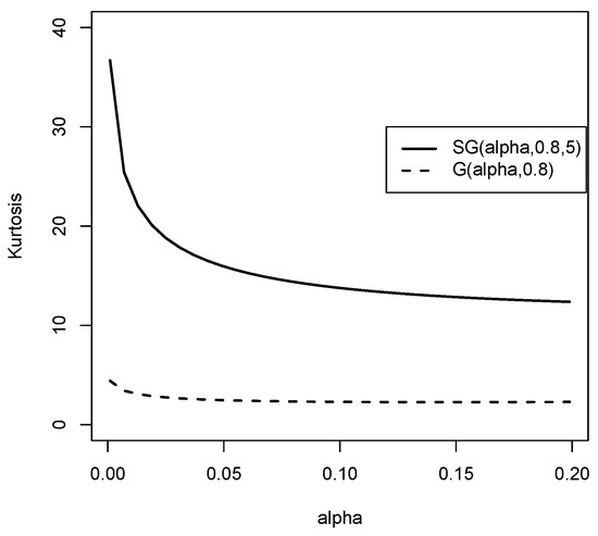 Figure 7 graphically shows that for small values of alpha, the kurtosis coefficient is higher in the SG distribution than in the G distribution.