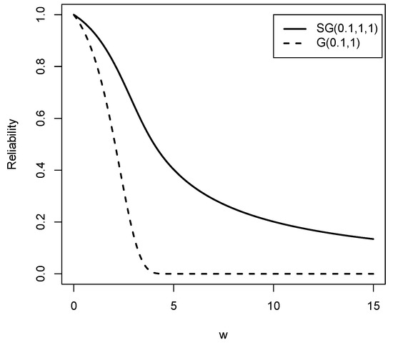 2.3. Reliability Function Comparison of Gompertz, Slash Birnbaum Saunders and Slash Gompertz Distributions