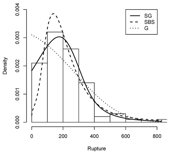 Rupture data histogram with Density (solid line), G density (dashed line) and density (dotted line).