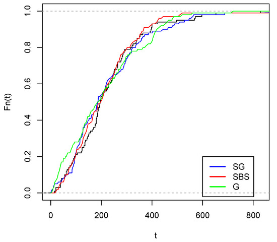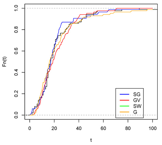 Figure 12 and Figure 13 show the best fit of the Slash Gompertz model compared to the Slash Weibull and Gompertz-Verhulst distributions. In the first, it can be seen that the theoretical quantiles are quite close to the line with respect to the Slash Gompertz, Gompertz-Verhulst and Slash Weibull distributions. In the second figure, the approximation of the empirical CDF of the studied model is closer to the empirical CDF than the other distributions.