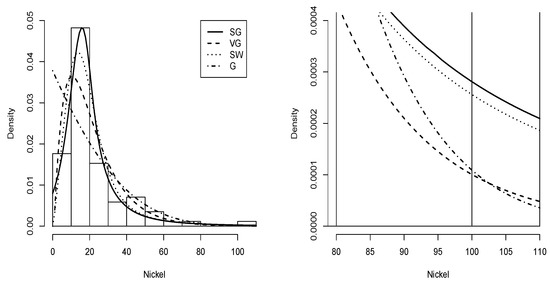 Data nickel histogram with density (solid line), density (dashed line), density (dotted line) and G density (dashed-dotted line).