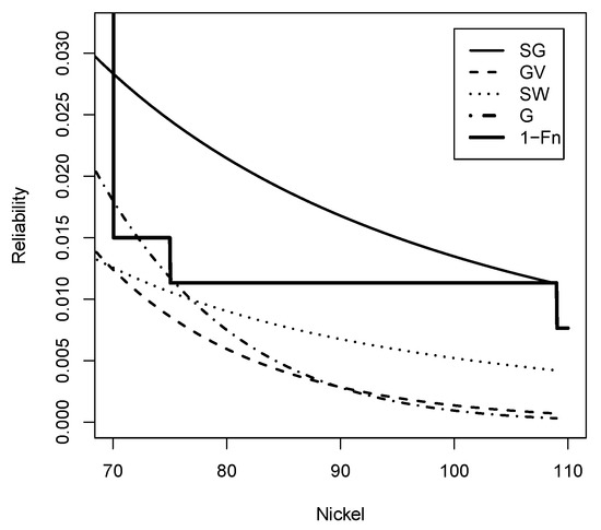 Reliability function (Solid line), (dashed line), (dotted line), G (dashed-dotted line) and Empirical reliability (Solid Line) for nickel data set.