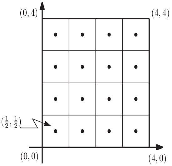 Example 15. Let S be the same set of Example 1. The three possible choices for preserve S and have the subgroup , where is the translation by c, is the rotation of around the origin, is the reflection on the axis y and is the reflection on the x axis. These three symmetry groups preserve S and have in common the subgroup . Consider the signal set in the torus , , which can be seen as the set of vertices of a regular graph in (see Figure 6). Each one of the three choices for induces a different label for the 16 points of , that is, for the tessellation in the torus. We have , and . In a similar way to Example 4, endowing the group of labels with the metric of the flat torus, the matched labeling is an isometry. Remark 11. It is worth noting that in item (c) of Example 11, we saw that is one of the possibilities. Notice that the alphabet is obtained naturally from the relationship between the set S and the group of labels coming from its symmetry group during the labeling process, and in this case, the natural distance matched to S is the Hamming metric.