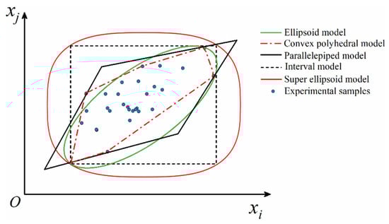 In addition to the above models, other types of non-probabilistic methods have also been developed in terms of various requirements for uncertainty modeling, such as possibility theory (see [69]), the information gap model (see [70]), the parallelepiped model (see [71]), the super ellipsoid model (see [72]) and the convex polyhedral model (see [73]). To intuitively exhibit the characteristic of different non-probabilistic convex modeling techniques in uncertainty quantification, the envelope results of experimental samples under five types of convex models are shown in Figure 2.