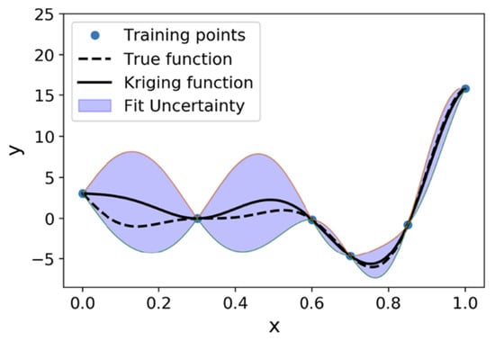 Kriging model. The Kriging, also known as Gaussian process regression, is an interpolation methodology based on Gaussian processes governed by prior covariance, as shown in Figure 5. A general form of Kriging can be formulated as a summation of two components: a trend of mean prediction determined by several basis functions at known locations and a random error with zero-mean distribution [139]: