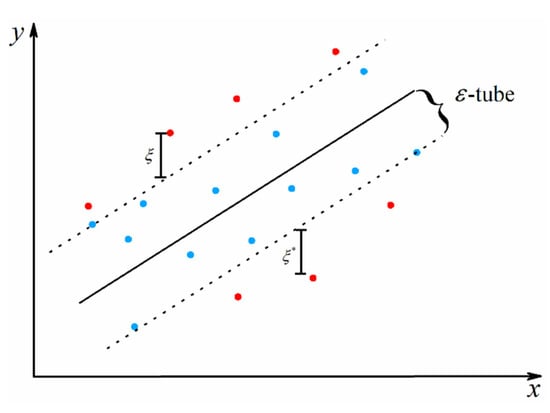 where is a linear version of SVR, denotes the predicted value, slack variables and allow the existence of outliers outside the -tube, and the regularization constant (also known as penalty coefficient) here achieves a trade-off between the model complexity and the empirical risk. For better understanding, a typical SVR model is shown in Figure 6.