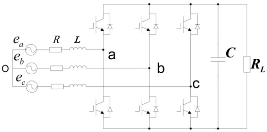Figure 1 shows the topology of a two-level three-phase PWM rectifier, where R, L, C, and indicate the resistance of the input filter, the inductor of the input filter, the DC-side capacitor, and the load resistor, respectively.