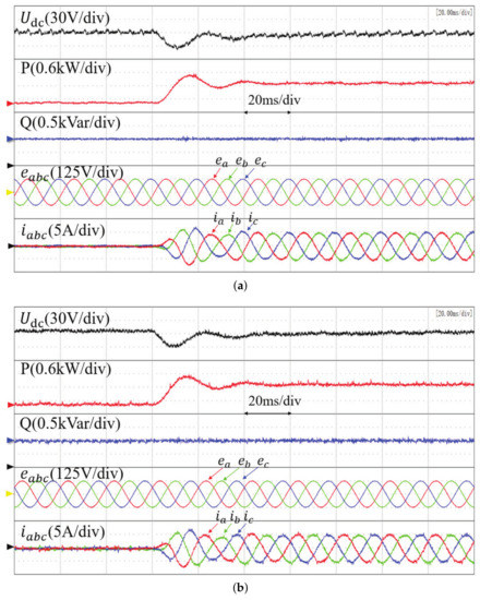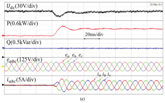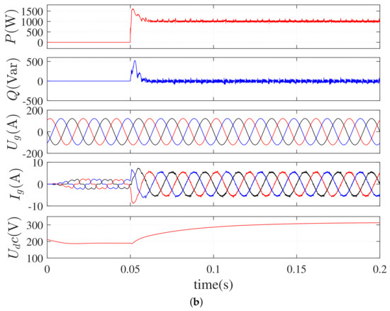 Figure 9 shows the experimental results of a sudden load change for the three methods, in which the DC voltage reference is 300 V and a 100 resistive load is suddenly applied to the system. It is seen that the DC voltage recovers to the original reference value of 300 V after a small voltage drop. The active power rises rapidly to balance the load change, and the reactive power remains constant. The THD of the grid current under conventional MPPC, the proposed basic MFPPC, and the improved MFPPC method is 5.08%, 7.49%, and 4.46%, respectively. The proposed improved method has the best steady-state performance.
