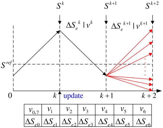 where , , and represent the complex power calculated at the , , and instant, respectively. Here, is the voltage vector applied between the instant and the instant, and is the voltage vector applied between the instant and the instant.