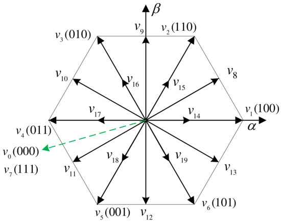 Compared to the power prediction in (16) of the proposed basic MFPPC, the power prediction in (22) is more accurate and timely, because both and are online updated in each control period, which solves the problem of stagnant update in the proposed basic MFPPC. However, as only one voltage vector is applied during one control period, the steady-state performance is still not satisfactory. To improve the steady-state performance of the proposed basic MFPPC, this paper adopts an extended finite control set including 20 voltage vectors rather than 8 voltage vectors in the basic MFPPC. Figure 4 shows the 20 voltage vectors, which include 8 basic voltage vectors and 12 synthesized voltage vectors. These 20 voltage vectors are listed in Table 1.